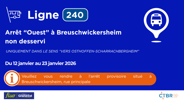 A compter du mercredi 20 août 2025 l'arrêt GEUDERTHEIM " Mairie " ( sens : BRUMATH => HOENHEIM ) est déplacé de 150 mètres en direction de BIETLENHEIM en raison de travaux au niveau de l'école élémentaire.