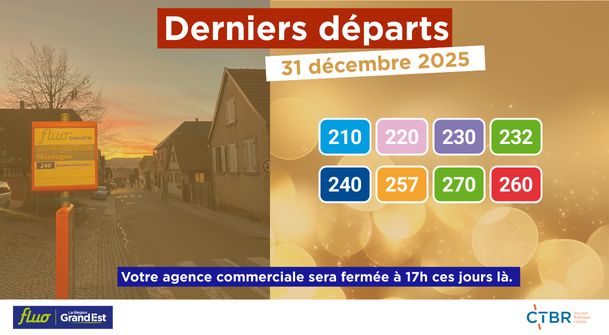 À l’occasion des fêtes de fin d’année, le service de la ligne 234 est adapté en soirée les 24 et 31 décembre 2025. La correspondance suivante en direction de Strasbourg ne pourra pas être assurée :